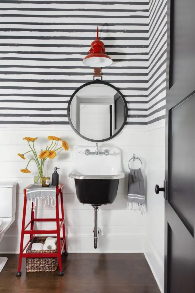 If you want to style a half bath in a farmhouse, a wooden style will be great for you. Use a wood-imitating wallpaper and some similar-style decoration, and your washroom will look simply fantastic!