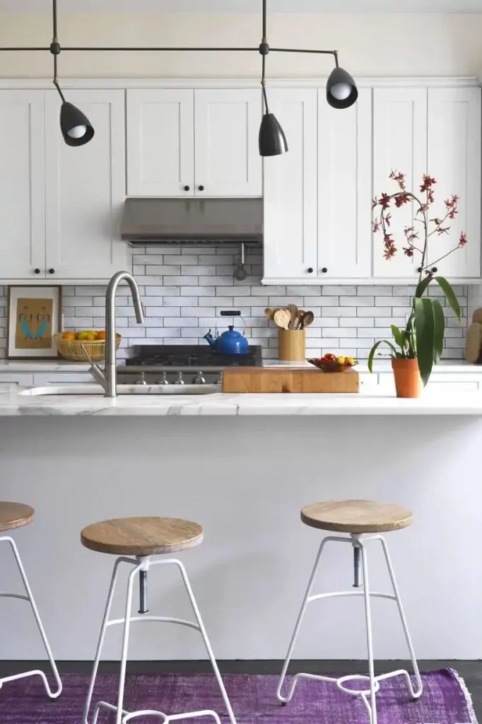 No matter how creative you feel, there is a safe and straightforward way to bring vibrant accents to an all-white kitchen with affordable lamps. You don’t need red or some unusual color: strict black lighting equipment is enough.